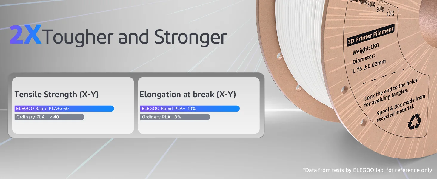【Enhanced Strength & Toughness】ELEGOO RAPID PLA+ filament features high flexural modulus and elongation at break, which makes it resistant to brittleness and cracking. This feature ensures that your prints are less deformed than usual PLA.
