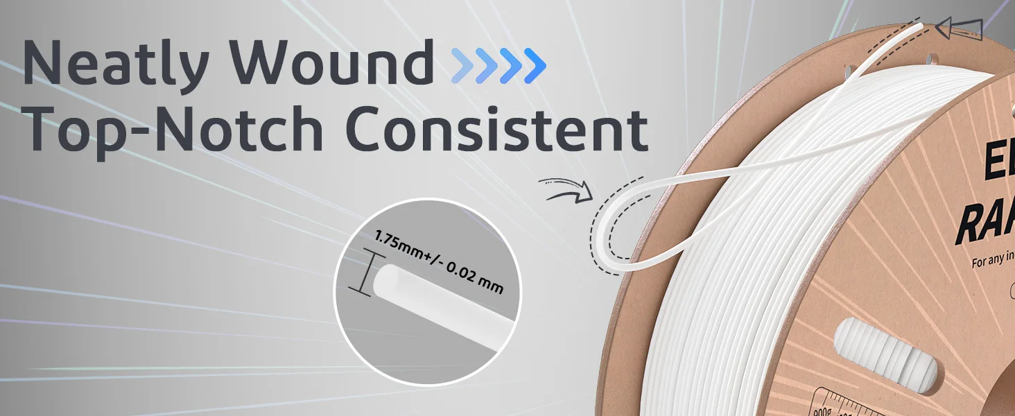 【±0.02mm Dimensional Accuracy】RAPID PLA+ filament boasts a dimensional accuracy of +/- 0.02mm and a strict tolerance of 1.75mm diameter, which ensures smooth and consistent filament outflow and reduces the risk of nozzle clogging.