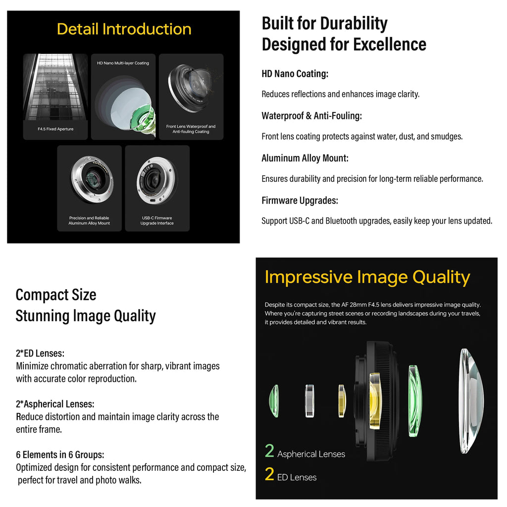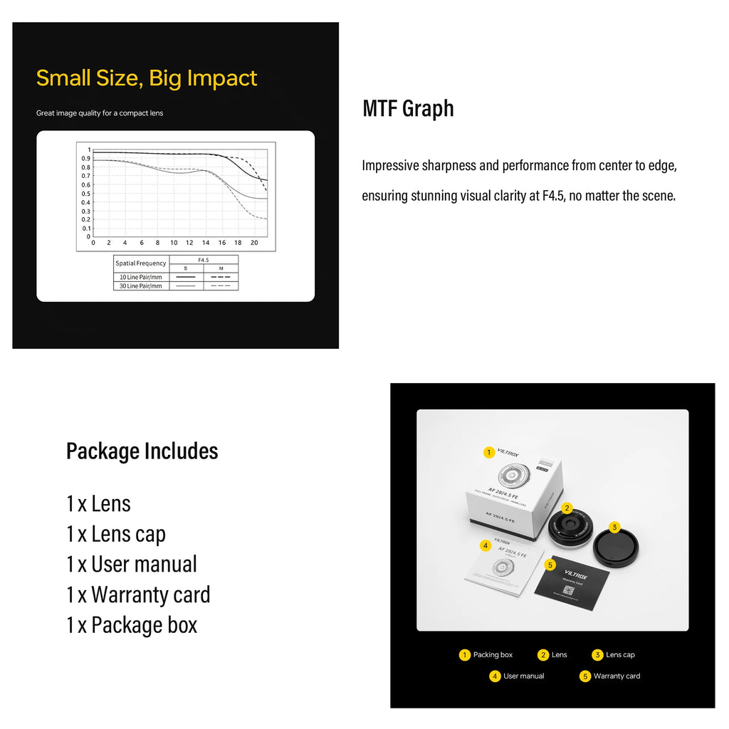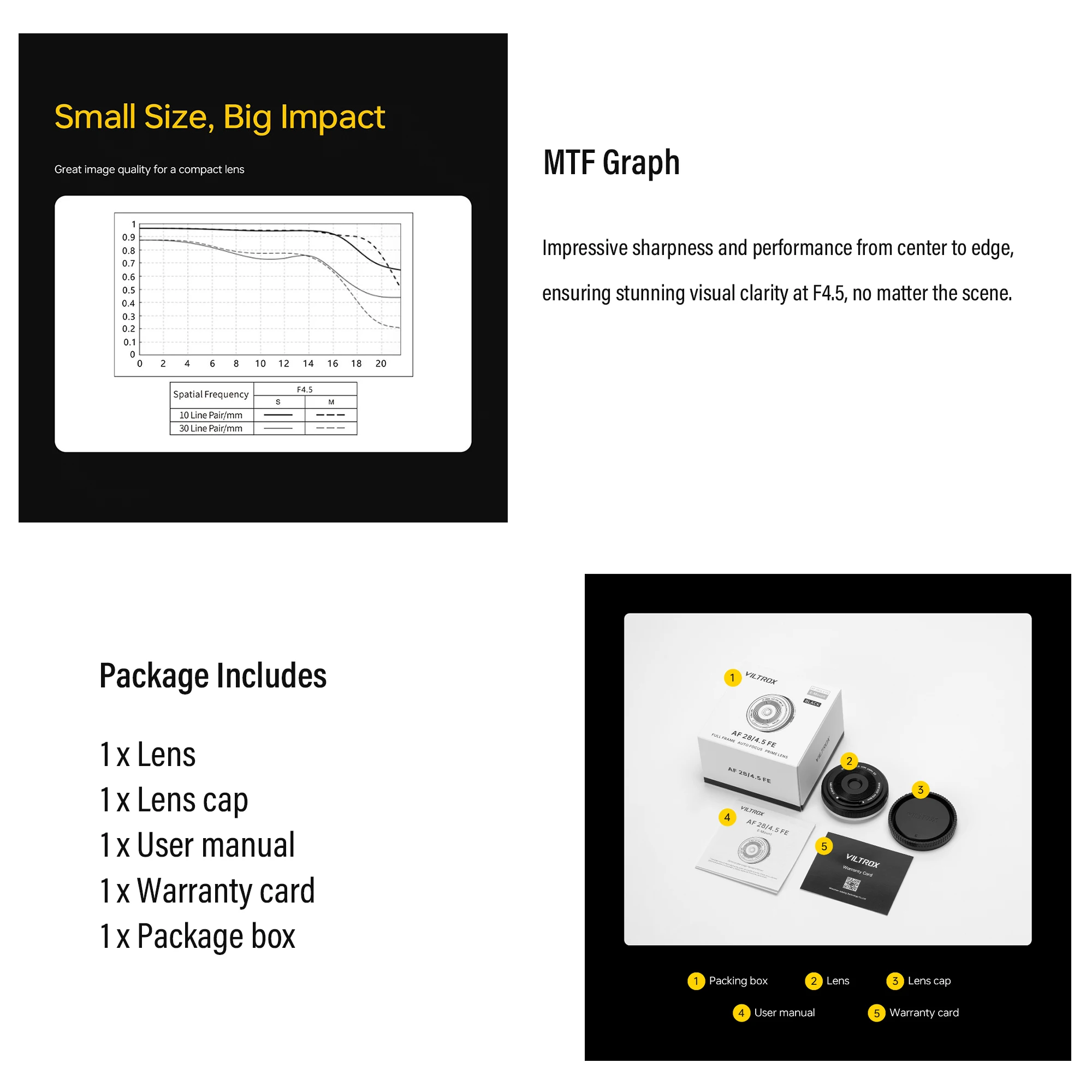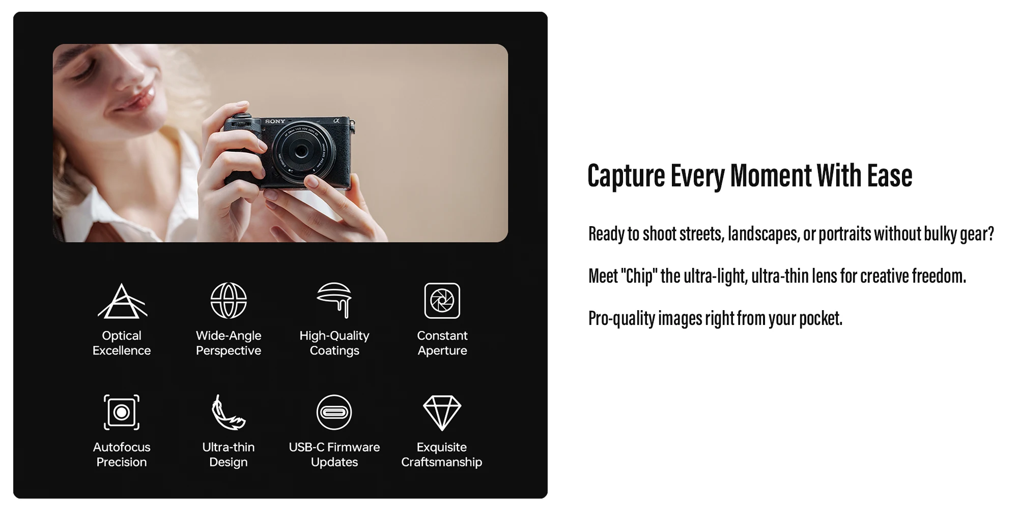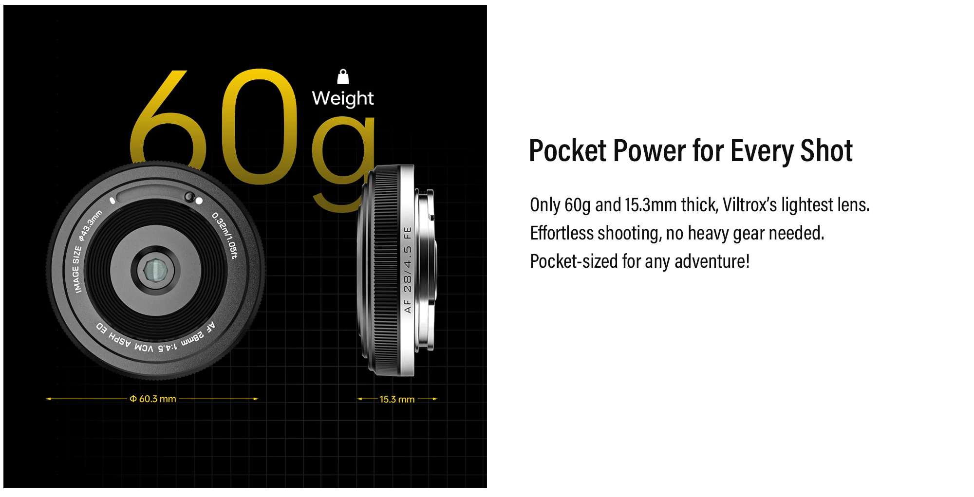 Weighs only 60g and measures 15.3mm, making it the lightest and thinnest Viltrox lens, perfect for easy, on-the-go shooting.